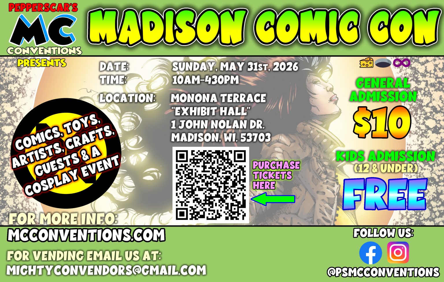 Madison Comic Con Monona Terrace Exhibit Hall 1 John Nolan Drive Madison, Wisconsin 53703 10-4:30 Hundreds of comic dealers, toys/TCG vendors, artists, guests, cosplay events, and more... 10 am 4:30 pm $10 general admission Kids 12 and under free.