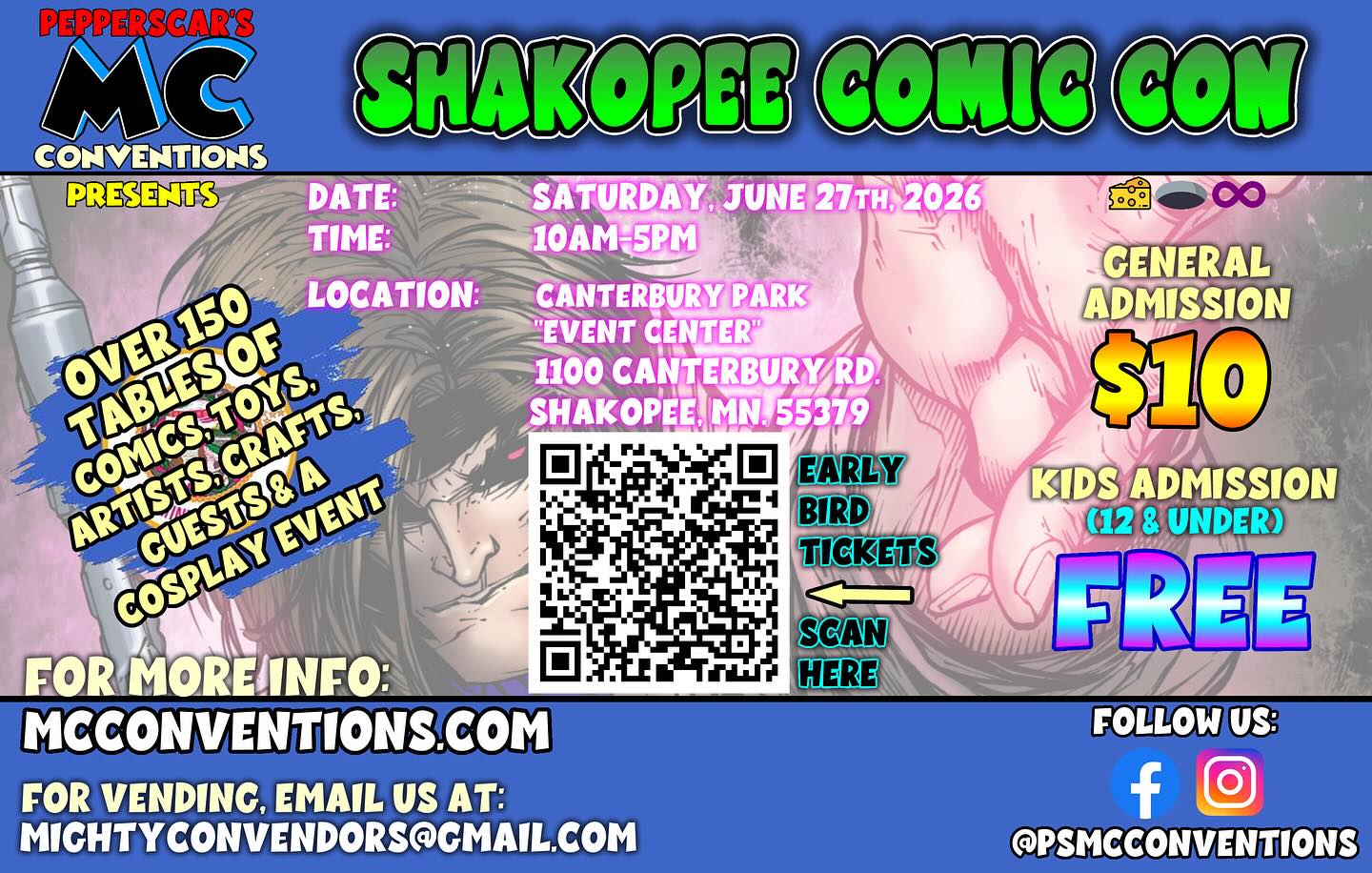 Shakopee Comic Con Canterbury Park Event Center 1100 Canterbury Road Shakopee, MN 55379 10-5 Over 150 tables of comics, toys, artists, crafts, guest and cosplay. $10 general admission Kids 12 and under free.
